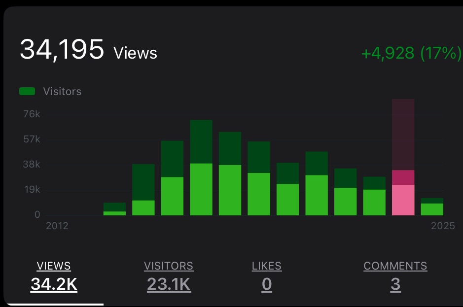 في العام ٢٠١٣ كانت نسبة المشاهدة و القراءة في الموقع هي ٣٨ مشاهدة و ٣٠ قراءة فقط