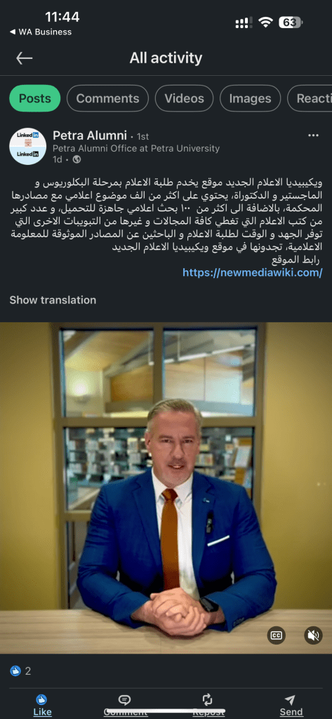 جامعة البتراء التي تخرجت منها كانت ولا زالت سباقه في متابعة ودعم الطلبة المتخرجين منها، فقد تم نشر رابط مدونة ويكيبيديا العلام الجديد على صفاتهم على موقعي Facebook، Linked