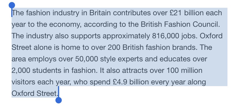 ٨. ٨١٦ الف وظيفة من الصناعات الساندة لصناعة الازياء “والتي تتواجد اكثرها في شارع اوكسفورد ضمن الشركات الكبرى”.