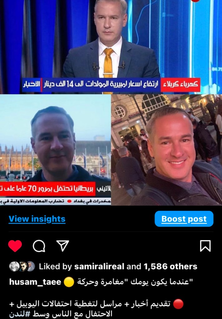 لم يسمحوا له بالصعود رغم حصوله على اذن فكانت حجتهم ان الاذن يسمح له بالصعود من الجهة الاخرى وليس من جهة “لندن اي” وبعد تواصل مع المدير المسؤول وضياع نصف ساعة تمت الموافقة على الصعود، عندها نصبنا اجهزة البث واجرينا اختبارات وكان كل شيء صحيح حتى جاءتنا صدمة اخرى، عند الساعة ٨:٣٠ مساء جاء رجل الامن وقال “ان مدير الامن منع تواجدكم على هذا الجسر ويجب ان تذهبون الى جسر “ويست منستر” والذي يبعد كلم و نصف تقريبا، كانت صدمة لنا فبعد نصب واعداد اجهزة البث الذي تطلب تقريبا ٤٠ دقيقة واجراء الاختبارات طلب منا رفعها مرة ثانية ونصبها بمكان اخر، بالنهاية رضخنا للامر الواقع و رفعنا الاجهزة بوجود قوى الامن ولكن توقفنا عند بداية الجسر المخصص للبث التلفزيوني و قام المصور باجراء مكالمات مع عدد كبير من المسؤولين تطلب ساعة تقريبا لتعود الموافقة على الصعود الى نفس النقطة السابقة، صعدنا و اعدنا فتح و نصب الاجهزة واختبارها وكانت الساعة ١٠:٢٥ تقريبا، لكن هذا المرة كنا مستعدين للتغطية دون اي عقبات.